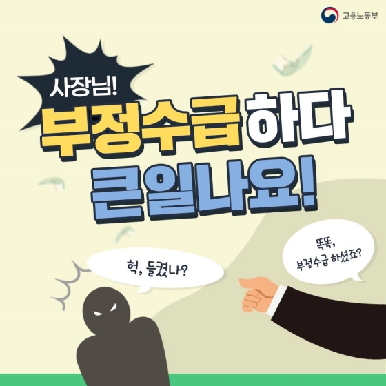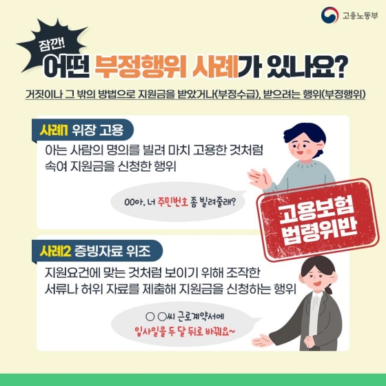 * 거짓이나 그 밖의 방법으로 지원금을 받았거나(부정수급), 받으려는 행위(부정행위) [사례 1. 위장 고용] “OO아. 너 주민번호 좀 빌려줄래?” 아는 사람의 명의를 빌려 마치 고용한 것처럼 속여 지원금을 신청한 행위 [사례 2. 증빙자료 위조] “OO씨 근로계약서에 입사일을 두 달 뒤로 바꿔요.” 지원 요건에 맞는 것처럼 보이기 위해 조작한 서류나 허위 자료를 제출해 지원금을 신청하는 행위