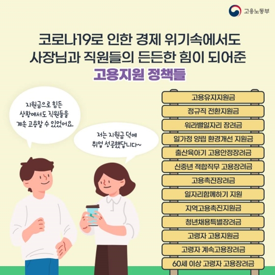 [고용노동부의 고용지원 정책] - 고용유지 지원금 - 정규직 전환 지원금 - 워라밸 일자리 장려금 - 일 가정 양립 환경개선 지원금 - 출산 육아기 고용안정 장려금 - 신중년 적합 직무 고용장려금 - 고용 촉진 장려금 - 일자리 함께하기 지원 - 지역 고용 촉진 지원금 - 청년채용 특별 장려금 - 고령자 고용지원금 - 고령자 계속 고용 장려금 - 60세 이상 고령자 고용장려금