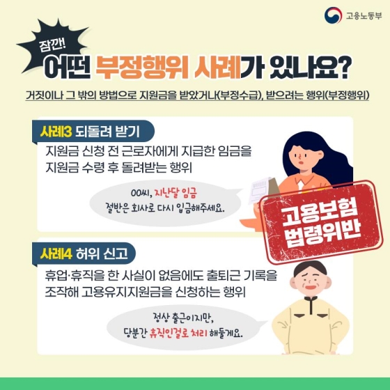 [사례 3. 되돌려 받기] “OO씨, 지난달 임금 절반은 회사로 다시 입금해 주세요.” 지원금 신청 전 근로자에게 지급한 임금을 지원금 수령 후 돌려받는 행위 [사례 4. 허위 신고] '정상 출근이지만, 당분간 휴직인 걸로 처리해둘게요.” 휴업·휴직을 한 사실이 없음에도 출·퇴근 기록을 조작해 고용유지 지원금을 신청하는 행위