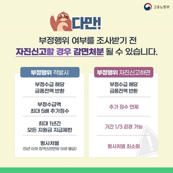 ◆ 다만! 부정행위 여부를 조사받기 전 자진신고할 경우 감면 처분될 수 있습니다. [부정행위 적발 시] - 부정수급 해당 금품 전액 반환 - 부정수급액 최대 5배 추가 징수 - 최대 1년간 모든 지원금 지급 제한 - 형사처벌(5년 이하 징역, 5천만원 이하 벌금) [부정행위 자진신고할 경우] - 부정수급 해당 금품 전액 반환 - 추가 징수 면제 - 기간 1/3 감경 가능 - 형사처벌 최소화