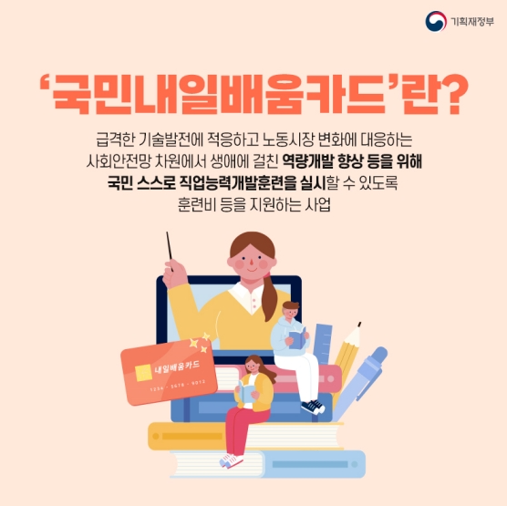 국민내일배움카드란 급격한 기술발전에 적응하고 노동시장 변화에 대응하는 사회안전망 차원에서 생애에 걸친 역량개발 향상 등을 위해 국민 스스로 직업능력개발훈련을 실시할 수 있도록 훈련비 등을 지원하는 사업입니다.