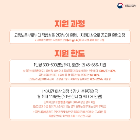 [지원 과정] 고용노동부로부터 적합성을 인정받아 훈련비 지원대상으로 공고된 훈련과정 * 세부훈련정보는 직업훈련포털 HRD-NET 홈페이지에서 직접 검색·확인 가능 [지원 한도] - 1인당 300~500만원까지, 훈련비의 45~85% 지원 ※ 국민취업지원제도 Ⅰ유형 및 Ⅱ형 저소득층(특정계층) 참여자는 훈련비의 100% 또는 80%, 국민취업지원제도 Ⅱ유형 중 청·중장년층 참여자는 50~85%, 근로장려금(EITC) 수급자·과정평가형 자격취득형 참여자는 72.5~92.5% 지원 등 - 140시간 이상 과정 수강 시 훈련장려금 월 최대 116천원(’21년 한시 월 최대 30만원) 단위기간(1개월)별 출석률이 80% 이상인 경우 지원(실업급여 수급 중이거나 소득이 있는 경우 등에는 일부 또는 전액 부지급) * 국민내일배움카드 훈련과정 및 일반고 특화과정에 참여하는 고3학생 등 특별훈련수당 제외(월 최대 116천원 지급)