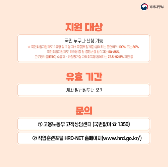 [지원 대상] 국민 누구나 신청 가능 ※ 국민취업지원제도 Ⅰ유형 및 Ⅱ형 저소득층(특정계층) 참여자는 훈련비의 100% 또는 80%, 국민취업지원제도 Ⅱ유형 중 청·중장년층 참여자는 50~85%, 근로장려금(EITC) 수급자·과정평가형 자격취득형 참여자는 72.5~92.5% 지원 등 [유효 기간] 계좌 발급일부터 5년 [문의] ① 고용노동부 고객상담센터(국번없이 ☎1350) ② 직업훈련포털 HRD-NET 홈페이지(www.hrd.go.kr/)